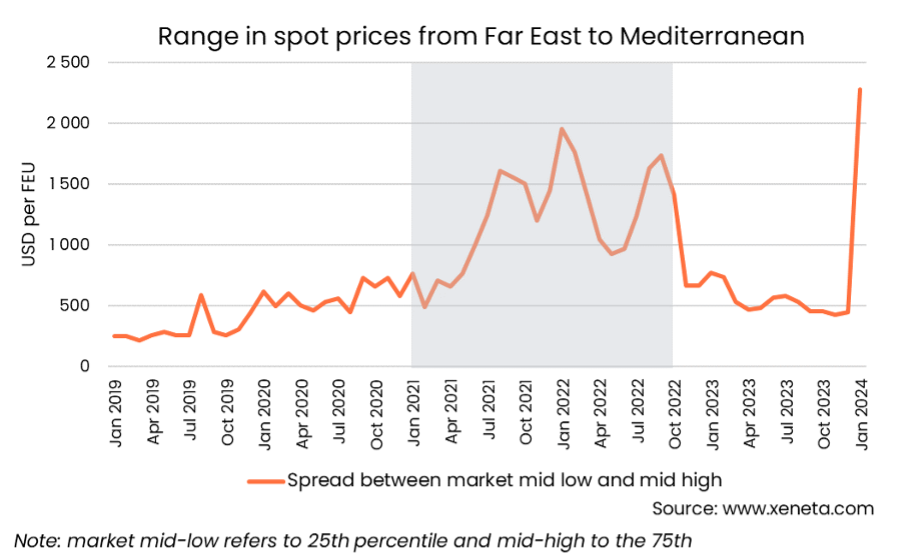 The range in rates shippers are paying on the spot market has also jumped up on other major trades that rely on the Suez Canal. Between the Far East and North Europe, the average spot rate has increased by 181% from mid-December to USD 4 640 per FEU. Here, the spread between mid-low and mid-high rates has averaged USD 1 730 per FEU in January 2024.