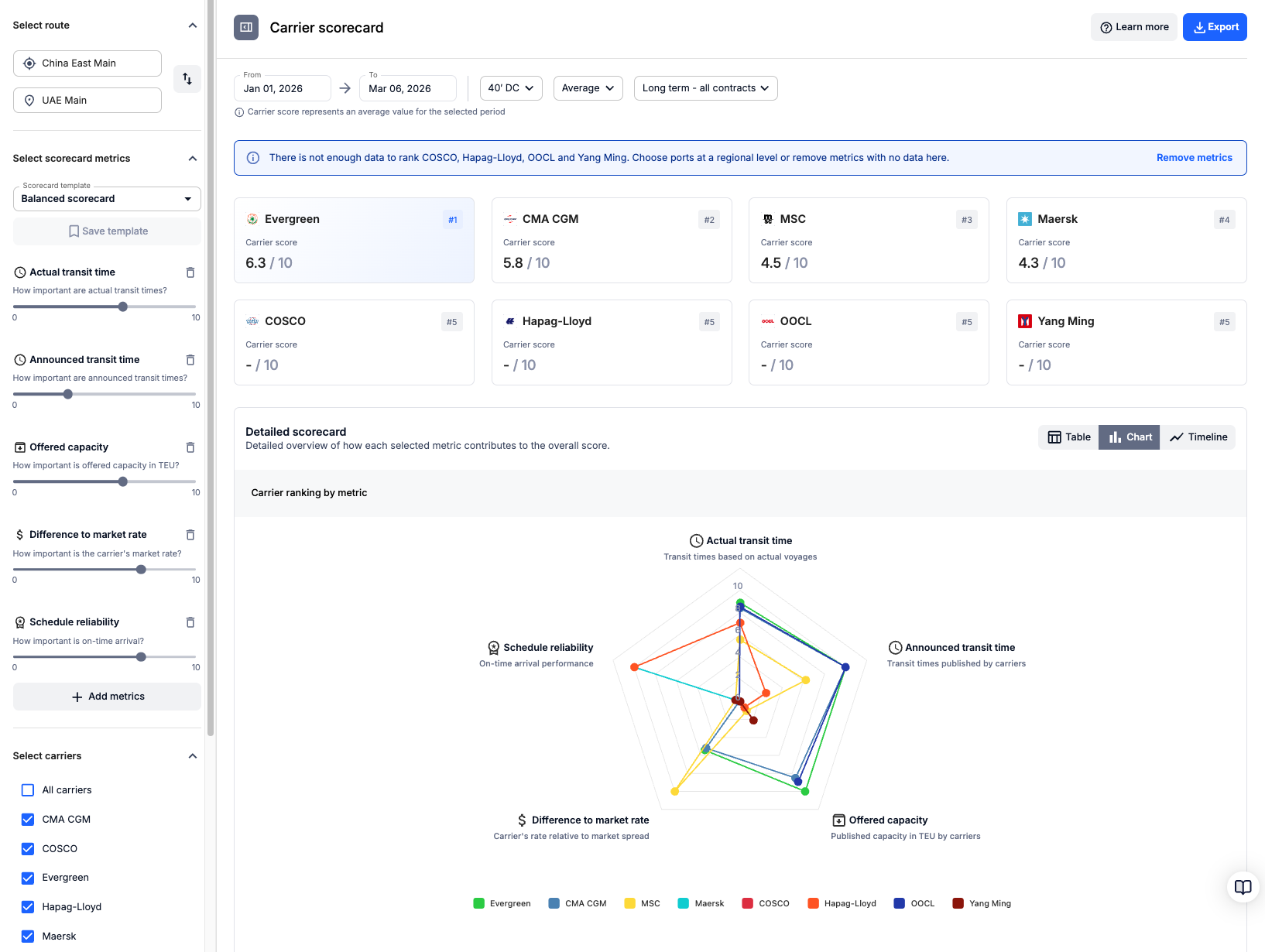 By benchmarking carrier performance across key metrics such as schedule reliability, transit time consistency, and contract compliance, procurement teams can move beyond price alone and make more informed allocation decisions.