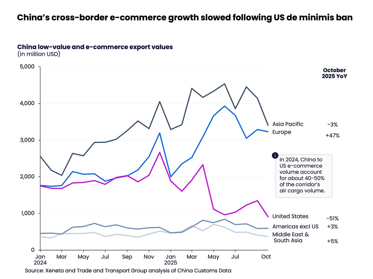 Van de Wouw highlighted warning signs for e-commerce volumes heading into 2026. “After 27 straight months of near +40% year-on-year growth, China’s total cross-border e-commerce sales were flat in October, based on the latest market data from China Customs,” he said. “Even robust expansion from China to Europe - up +47% in October - was offset by declines to the rest of Asia, down -3%, and a dramatic -51% drop in e-commerce shipment volumes to the US in this new post de minis environment.”